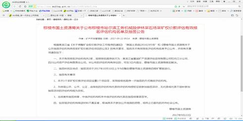 2017年10月10日上午,穆棱市国土资源局公开选定采矿权价款评估机构,按照黑龙江省《关于调整矿业权价款评估工作程序的通知》的相关要求,秉承公平、公开、公正的原则,严格采用公开报价与现场抽号相结合的方法选定评估机构承担采矿权价款评估工作,此次公选符合报名资格的2家公司分别是:黑龙江省寰诚矿产资源评估咨询有限公司牡丹江分公司、四川山河资产评估有限责任公司。由于四川山河资产评估有限责任公司没有到现场参加公选,最终确定“黑龙江省寰诚矿产资源评估咨询有限公司牡丹江分公司”承担了哈尔滨工务机械段伊林采石场采矿权价款的评估工作。