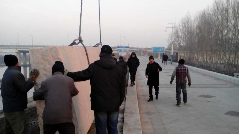 10月31日上午,穆棱河二期景观工程进行景观石安装。吊装数量为3块景观石,长度分别为4米,重量10吨;8米,重量25吨;12米,重量45吨的景观条石。由于堤上路及人行道宽度不能满足大型吊装机械的工作面宽度,施工单位采用了220吨的大型吊车在景观带的东岸向西岸进行吊装,并顺利地完成了吊装工作。