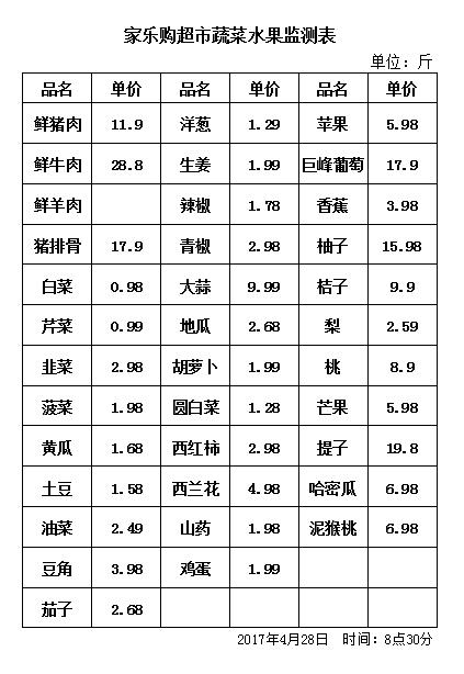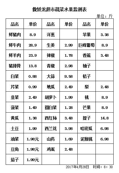 “五一”劳动节假期即将到来,市商务局对傲矫龙超市、家乐购超市的蔬菜、水果、生鲜、肉类等商品进行了市场监测,以此作为市民节日生活消费参考,加以借鉴。随着季节的更替,气温的走高,新鲜青蔬菜品大量上市,多数菜品价格量大低走;生肉、生鲜价格依旧平稳,上下浮动不明显。“蒜你狠”依旧保持强势,尚无亲民表现,今后一段时间,我们将持续关注。